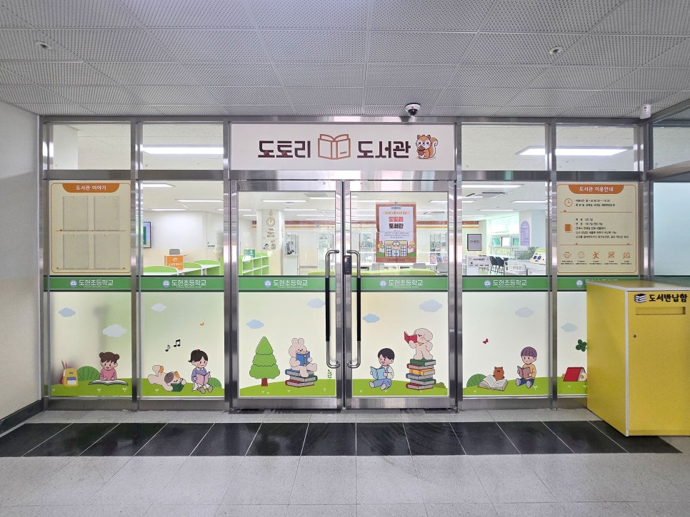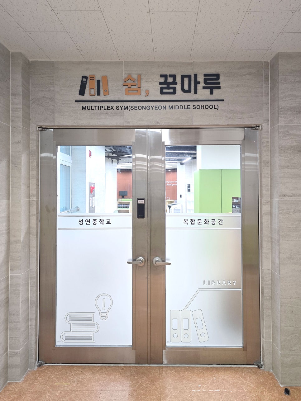 이천사동초등학교 도서관 이름 입체글씨, 출입문 시트지, 디자인 실사출력 등 설치사진