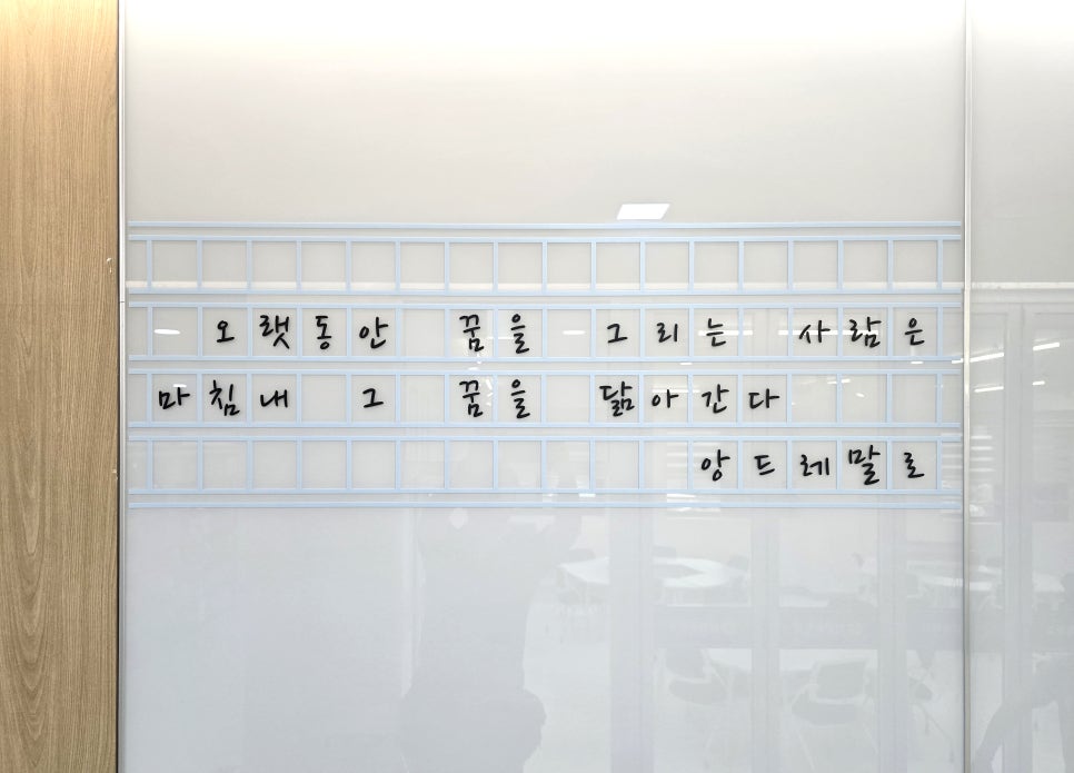 신탄진고등학교 출입문 시트지, 자석게시판, 벽면구성, 천장걸이 등 설치사진