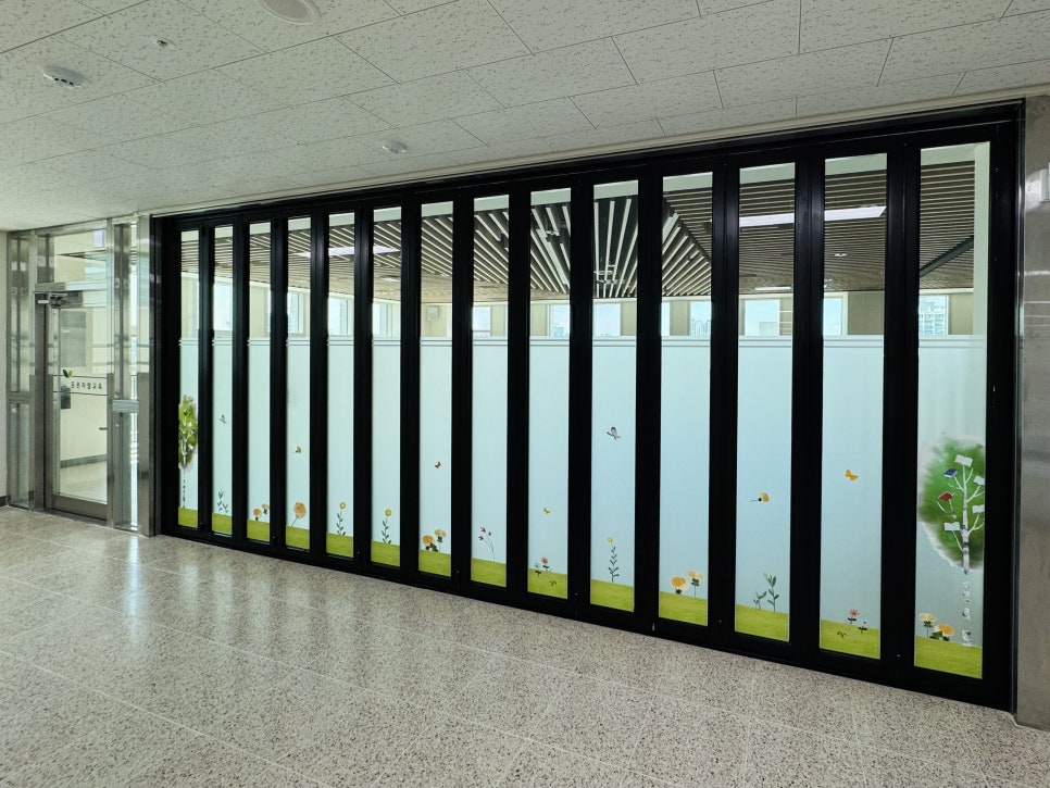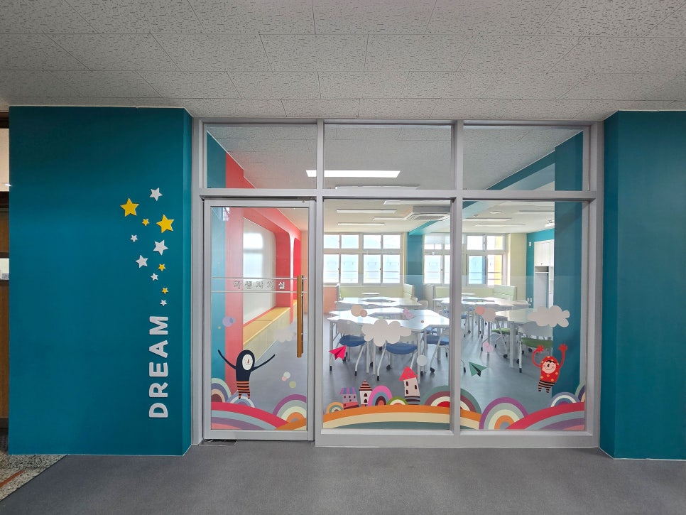 서울둔촌초등학교 출입문 띠지, 시청각실 디자인 시트지 설치사진(엠보시트,투명시트지)