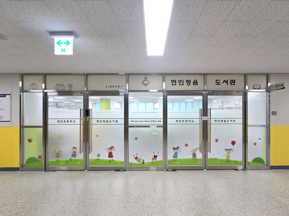 현민초등학교 도서관 출입문 디자인 시트지, 현판 시트지, 타공게시판, 방염 자작나무 벽면구성, 그라데이션 시트지 등 설치사진