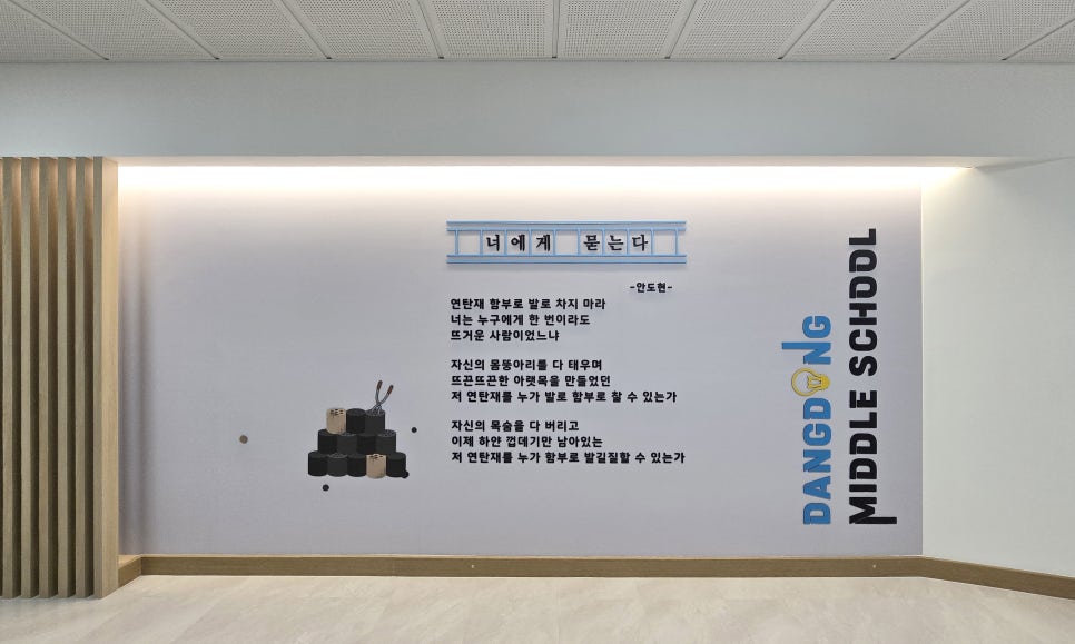 당동중학교 출입문 투명띠지, 상단 디자인시트, 도서관 입체글자 구성, 로비 벽면디자인 설치사진
