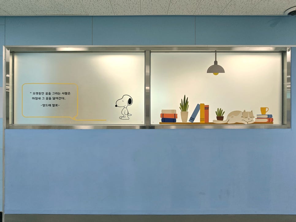 하남천현초등학교 학생자치실 유리시트, 미술관 벽면 입체글자, 액자고리 레일 설치사진(투명시트지)